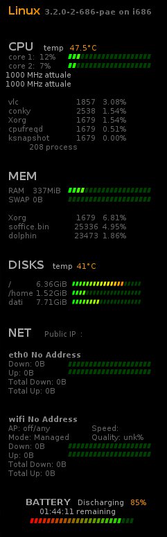 Come per superkaramba ho cercato per la rete (gnomelook) alla ricerca di qualcosa che mi piacesse e ho trovato 150600-conky7-2cores che ho poi modificato alle mie esigenze.